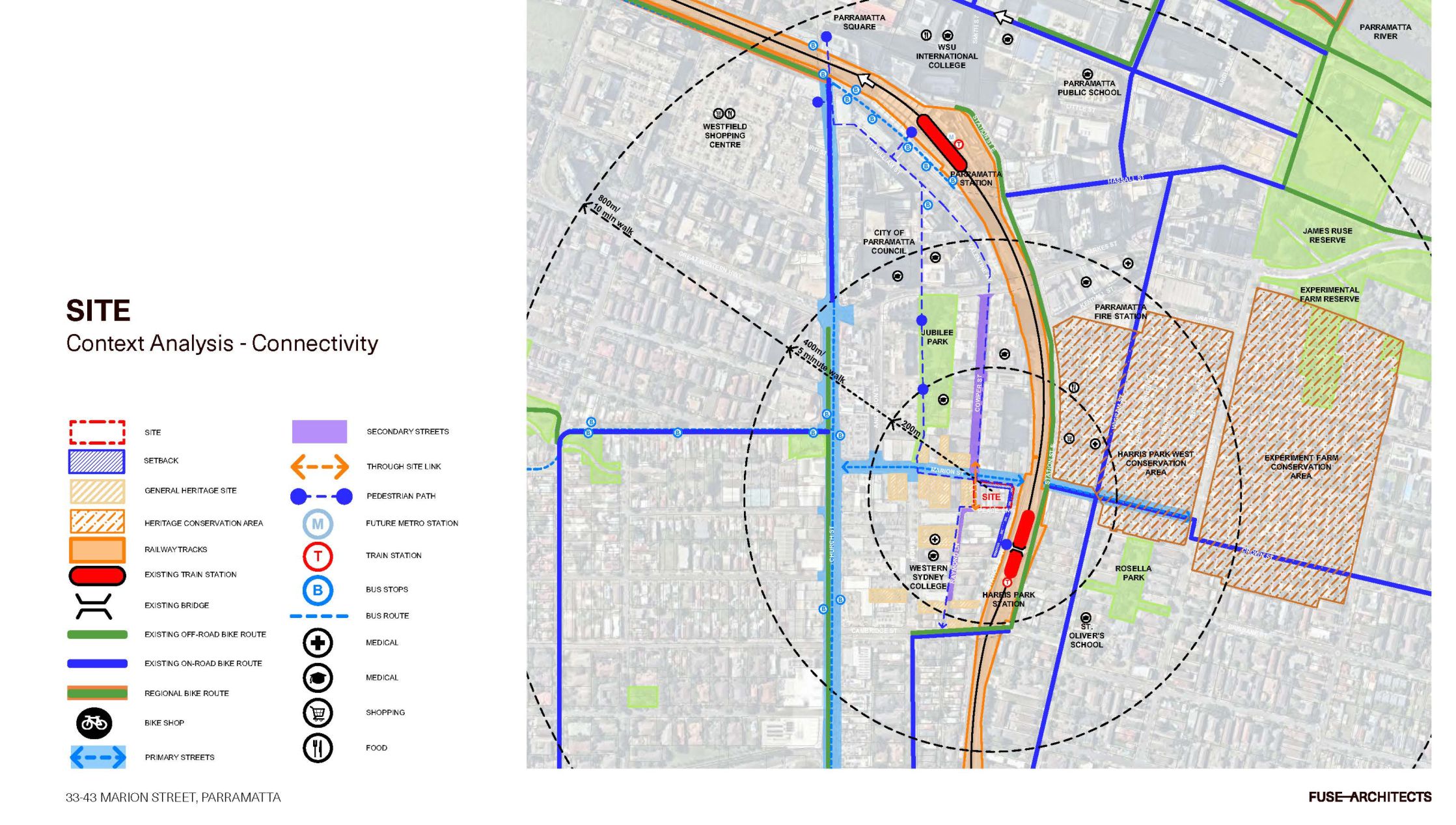 The site is contained within the Marion Street Special Area, which is located toward the southern fringes of the Parramatta City Centre. The Eastern edge of the Special Area is directly next to the railway line which bisects Marion Street. Harris Park Train Station is located within walking distance towards the south-east, and the precinct interfaces with Auto Alley to the West, a major pedestrian and vehicular corridor. Jubilee Park is the closest public open space, and to the South, Marion Street is bounded by the Station Street West Special Area. A Council owned carpark is situated within the north-east block and site-specific controls apply to the site at 33-43 Marion Street.